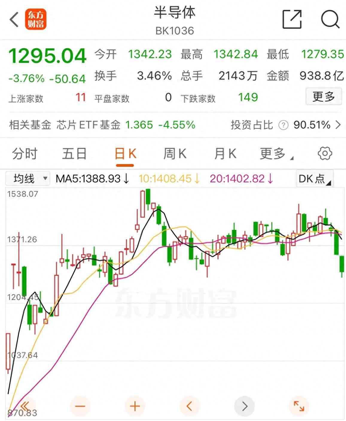 半导体板块(BK1036)指数今天又大跌3.76%,报收1295.04点,连续两天的跌幅近9%。近期高位参与半导体板块交易的投资者损失惨重。