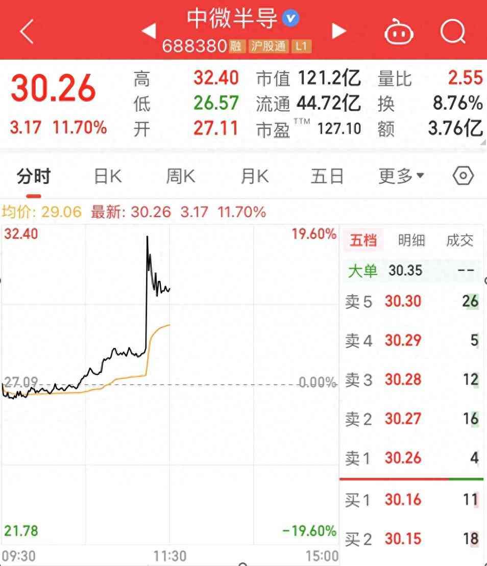 又见大象起舞。今天上午,中国移动、工商银行、中国石化、招商银行、中国神华……一批大市值龙头股纷纷上涨。不过与昨天相比,市场的大小盘分化有所收敛。微盘股指数早盘快速下跌,一度跌超2.5%,随后震荡拉升,上午收盘该指数上涨0.51%。临近上午收盘,半导体产业链突然拉升,涨幅不断扩大,存储芯片、光刻机等板块大涨,中微半导(688380)从涨幅不到5%的位置直线拉升,1分钟股价就接近涨停,上午收盘,该股上涨11.7%。