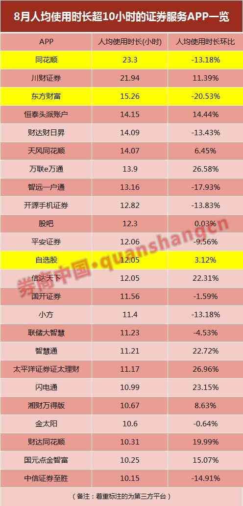 人均使用时长是评判证券服务APP用户黏性的另一个重要指标,同花顺APP8月份人均使用23.3小时,依然位居第一。川财证券8月份人均使用时长21.94小时,环比增幅11.4%,排名第二。