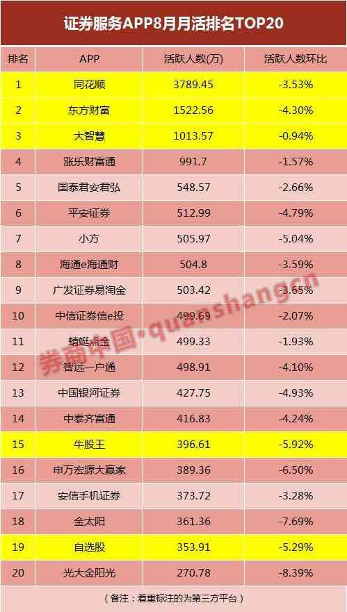 8月份月活超过3万的证券服务应用APP有19个,活跃人数环比均有所下滑,其中方正证券小方、申万宏源大赢家、国信证券金太阳、光大金阳光的活跃人数环比降幅均超过5%。