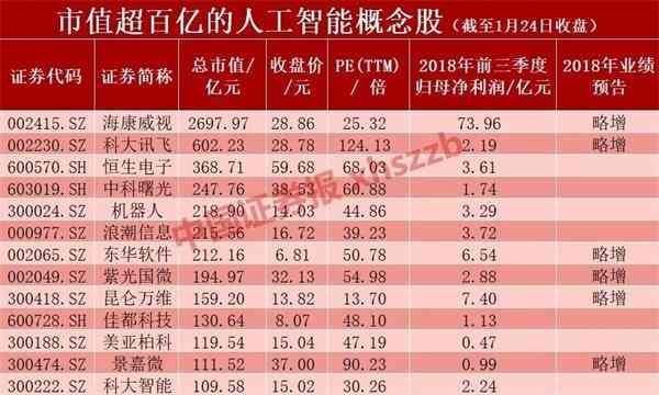 另外,中证君通过人工智能指数,梳理出人工智能领域市值超百亿的上市公司,供投资者参考。目前,上述公司中已有6家发布2018年业绩预告,且都为“略增”。