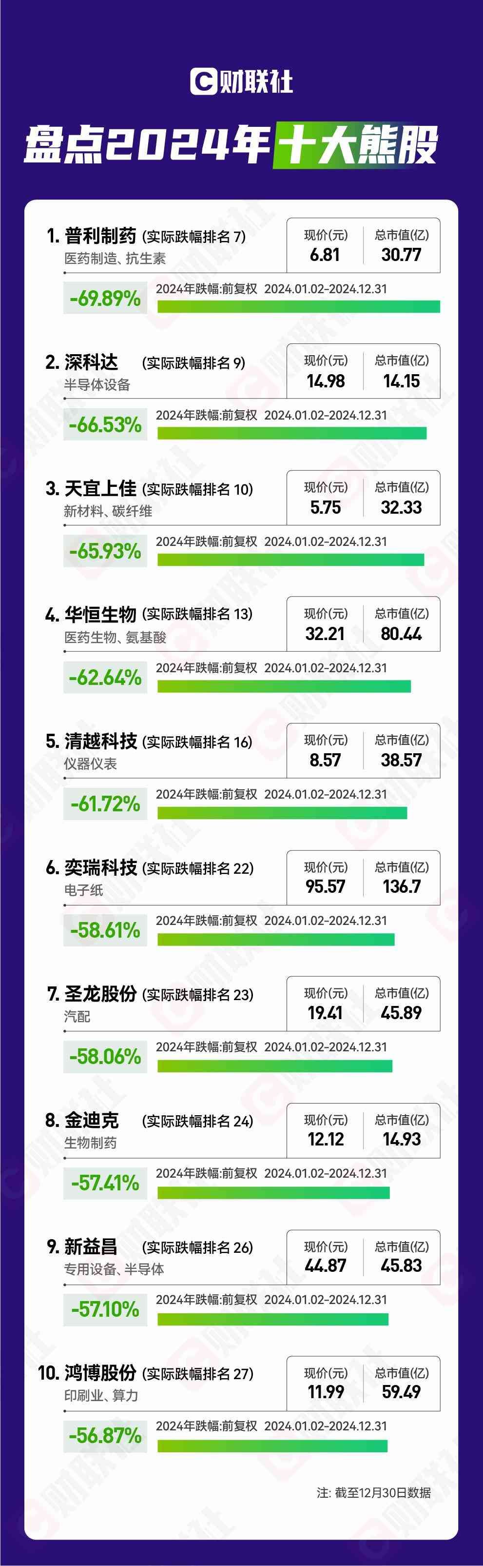 2024年A股跌幅榜中,前30的个股(未统计今年的退市股)均跌超56%,其中17只为ST股。剔除ST股后,跌幅前十的个股主要集中在科创板标的,医药生物行业公司三家,半导体设备企业两家。