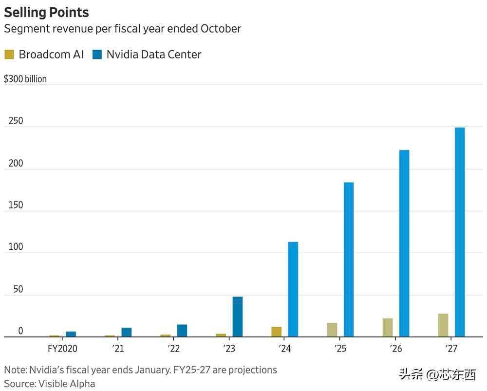 ▲截至10月,博通AI和英伟达数据中心每个财政年度的业务收入(图源:《华尔街日报》)