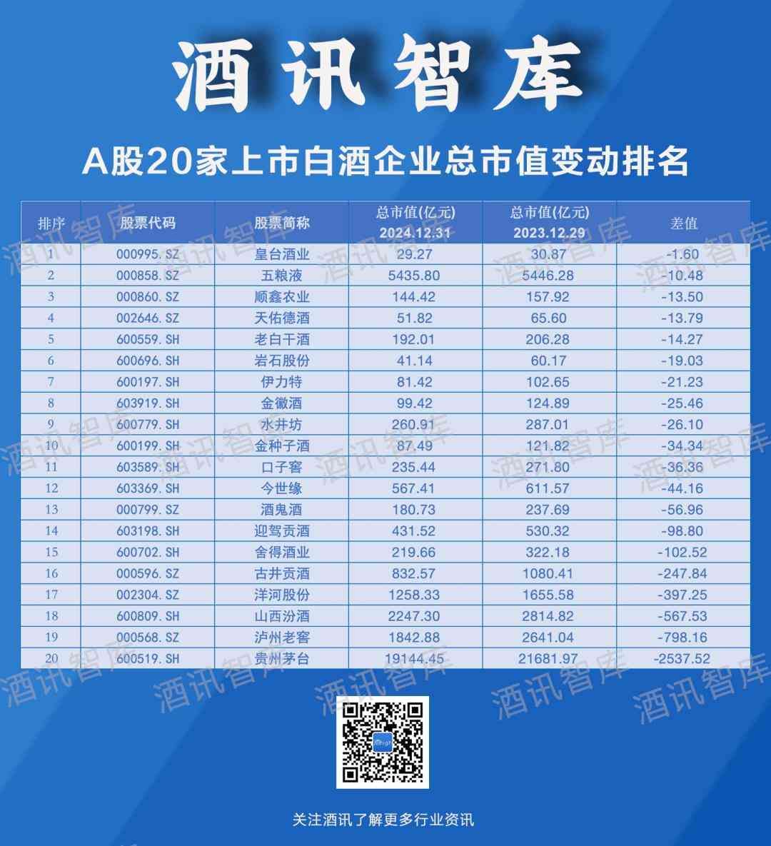 资本市场藏不住消费市场的波动,投资者的敏感神经时刻关注着风吹草动。酒讯智库针对2024年的白酒股市值表现进行梳理,从市值变动、市值涨跌等纬度,观察白酒股2024年的成长情况,制作了“2024白酒股市值增长榜”(下称“市值增长榜”),以市值增长情况探索白酒资本市场的动荡本因,展望白酒行业发展趋势。