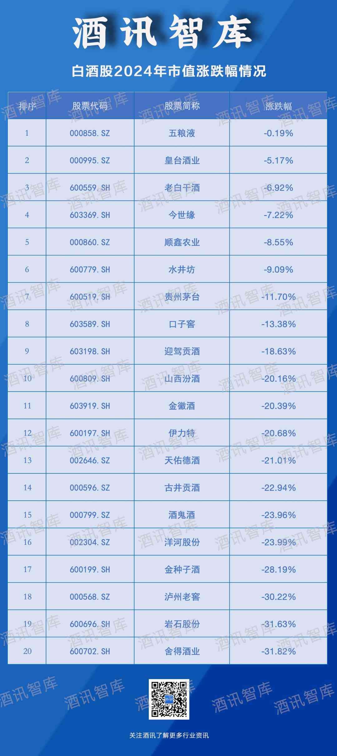 酒讯智库统计了解到,2024年内,A股20只白酒股全部录得区间下跌,跌幅在0.19%-31.82%之间。其中,五粮液跌幅最小,为0.19%;舍得酒业最大,为31.82%。