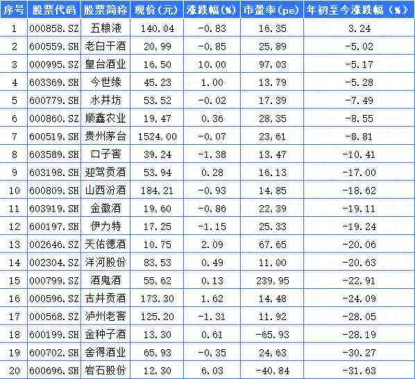 岩石股份、舍得酒业、金种子酒分别以-31.63%、-30.27%、-28.19%列年涨幅最后三位。