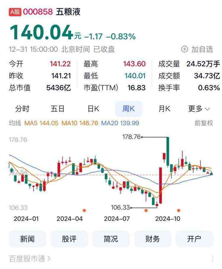 2024年12月31日,五粮液下跌0.83%,报收140.04元,换手率0.63%,总市值5436亿元,年涨幅为3.24%,列白酒A股第一,也是全年唯一涨幅为正的白酒A股。