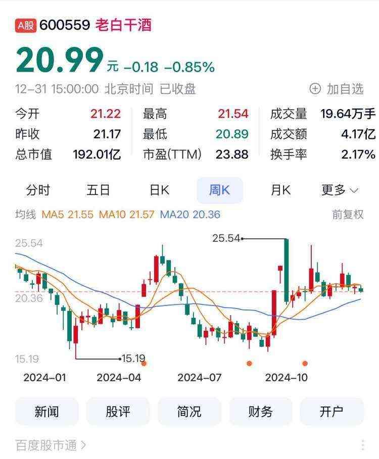 2024年12月31日,老白干酒下跌0.85%,报收20.99元,换手率2.17%,总市值192.01亿元,年涨幅为-5.02%,列白酒A股第二。