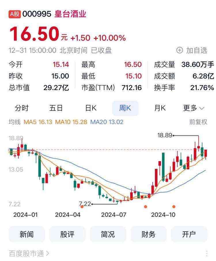2024年12月31日,皇台酒业报收16.50元,涨幅为10.%,换手率21.76%,总市值29.27亿元,年涨幅为-5.17%,列白酒A股第三。