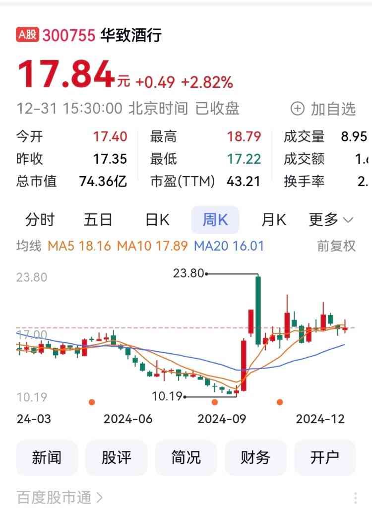 2024年12月31日,唯一酒类流通A股华致酒行报收17.84元,涨2.82%,换手率2.15%,滚动市盈率43.21,总市值74.36亿元,2024年以来累计涨幅5.11%。