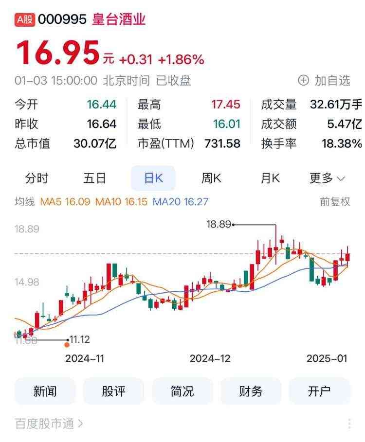 1月3日,皇台酒业报收16.95元,上涨1.86%,换手率18.38%,总市值30.07亿元,今年以来涨幅为2.73%,居第一。