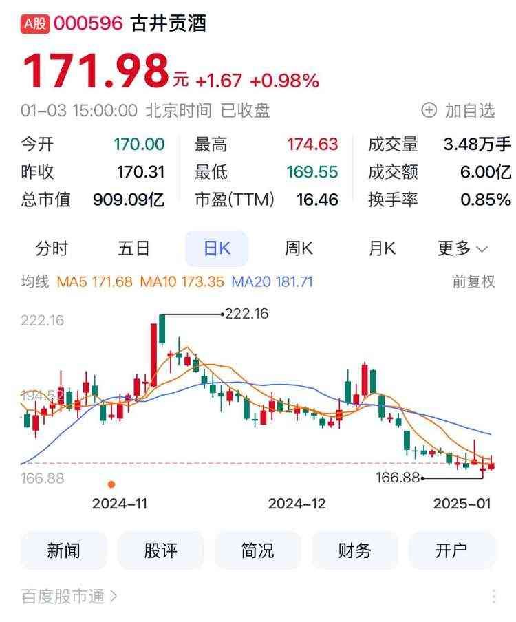 1月3日,古井贡酒报收171.98元,上涨0.98%,换手率0.85%,总市值909.09亿元,今年以来涨幅为-0.76%,居第二。