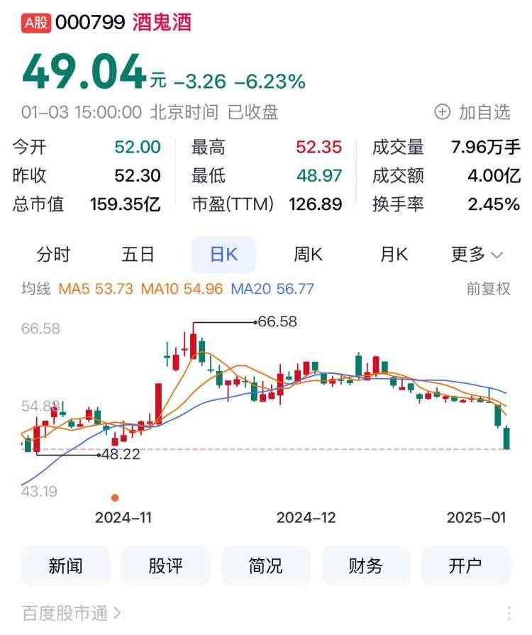 1月3日,酒鬼酒报收49.04元,下跌6.23%,换手率2.45%,总市值159.35亿元,今年以来涨幅为-11.83%,居最后一位。