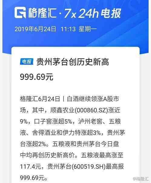 6月24日,贵州茅台(6519.SH)在早盘再度向千元大关冲刺,一度涨至999.69元,离关键的千元大关仅一步之遥。