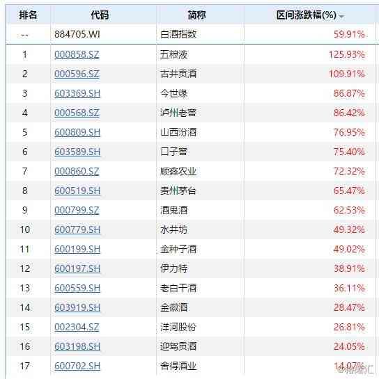 事实上,今年以来的白酒板块表现可谓无比亮眼,截止今日,整个白酒板块指数今年涨幅将近60%,远远跑赢大部分市场其他概念指数。其中五粮液、古井贡酒的成功实现翻倍,今世缘、泸州老窖、山西汾酒、口子窖、顺鑫农业涨幅也超过了70%。