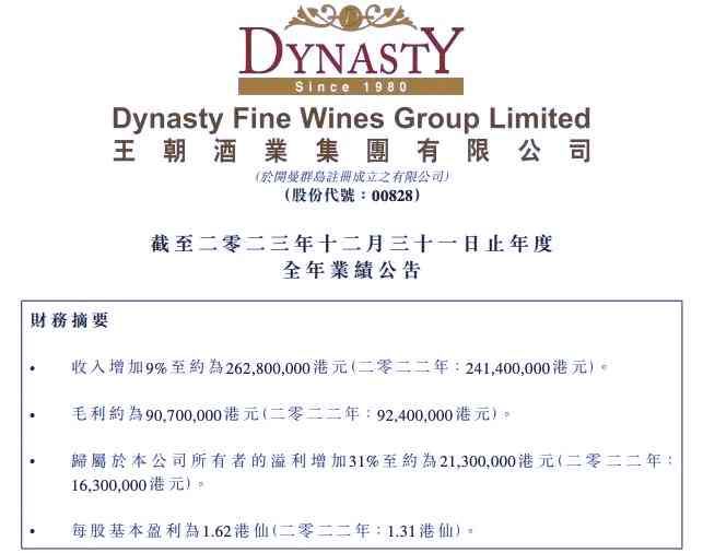 王朝酒业2023年实现营业收入约为2.63亿港元,同比增长9%,归母净利润约为0.21亿港元,同比增长31%。按产品来看,王朝酒业的红葡萄酒展现出强劲的发展实力,销售额约为1.38亿港元,同比增长21.25%,超越白葡萄酒的1.15亿港元,重新夺回第一大盈利品类的宝座。