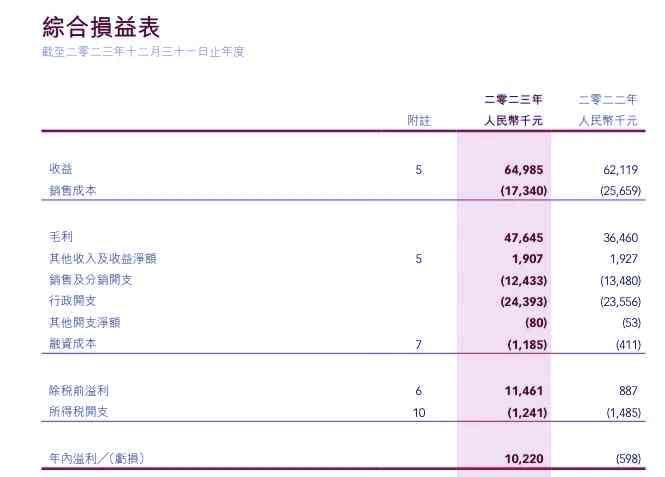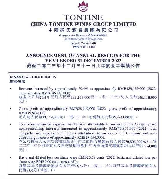怡园酒业2023年营业收入0.65亿元人民币,同比增长4.61%,归母净利润0.1亿元人民币,在去年亏损60万的基础上,扭亏为盈。财报显示,怡园酒业的业绩增长主要由于高端葡萄酒的销售额增加。