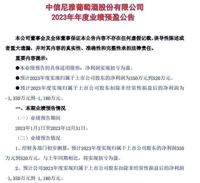 最后,中信尼雅在业绩预告中透露,2023年预计实现净利润350万元到520万元,而2022年同期的亏损额高达8.81亿元。据悉,该增长主要由于中信尼雅营销体系的改革及葡萄酒销售额的增长。