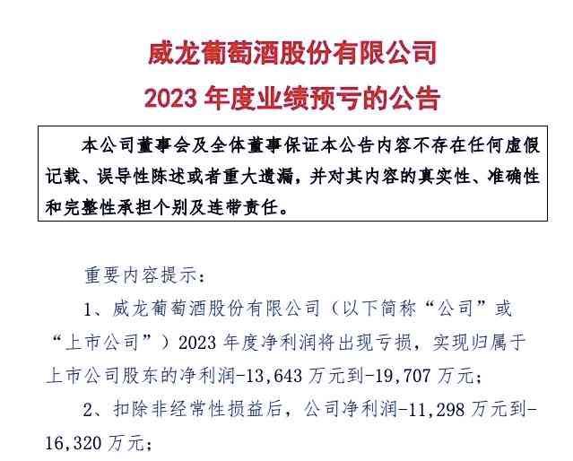 威龙股份公布了2023年的业绩预告,归母净利润预计亏损1.36亿元-1.97亿元。报告显示,主要由于受国家对澳大利亚反倾销税政策的影响以及产品策略调整,部分原酒、蒸馏酒精因储存时间过长、品质降低等原因,对原酒、自制蒸馏酒精、生产性资产、固定资产计提预计减值约 1.1亿元。