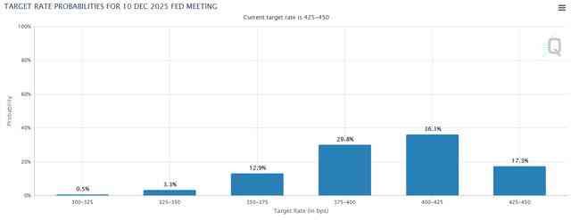 根据芝加哥商品交易所的美联储观察工具,超过 50% 的市场参与者预计,到 2025 年底,利率将降至 3.75-4.25% 的区间,最多相当于降息半个百分点。