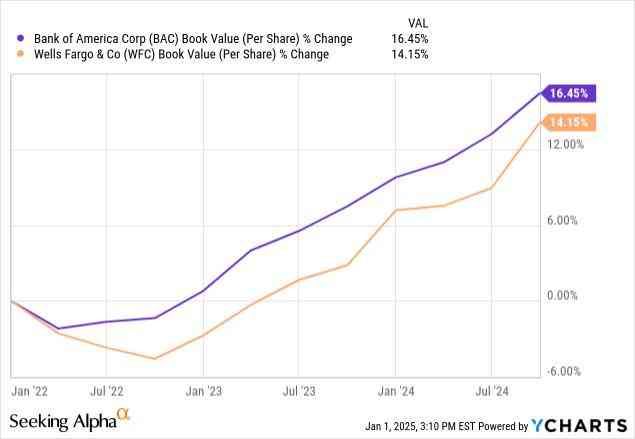 在过去三年中,美国银行的账面价值持续增长,共增长了 16.45%,而富国银行的账面价值增长了 14.15%。