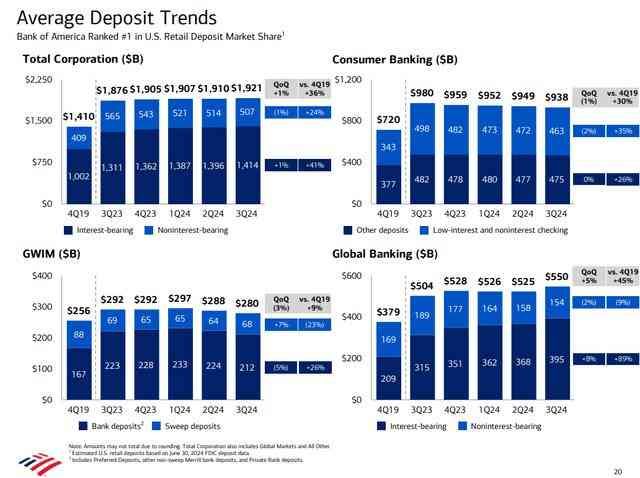 美国银行一直能够利用其品牌知名度不断扩大其存款基础。截至 2024 年 9 月 30 日,美国银行的平均存款额为 1.92 万亿美元,自 2019 年底以来增长了 24%。这一增长主要得益于计息账户的增长,尤其是消费者银行和全球银行部门的增长。