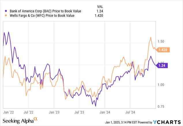 目前,美国银行的售价比账面价值高出 24%,而富国银行的股票以账面价值的 1.42 倍易手,因此比账面价值高出 42%。