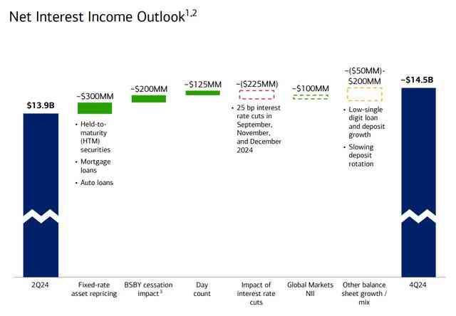 2024 年第二季度,美国银行预测 2024 年第四季度的净利息收入为 145 亿美元。对于 2025 年,预测美国银行的净利息收入将达到 140-150 亿美元,这得益于强劲的存款增长。