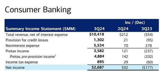 美国银行最大的部门是其消费者银行部门,该部门创造了 27 亿美元的利润,比上一季度增长了 4%。当美国经济增长且消费者对经济前景充满信心时(就业形势强劲、工资增长),美国银行的消费者银行部门表现良好。