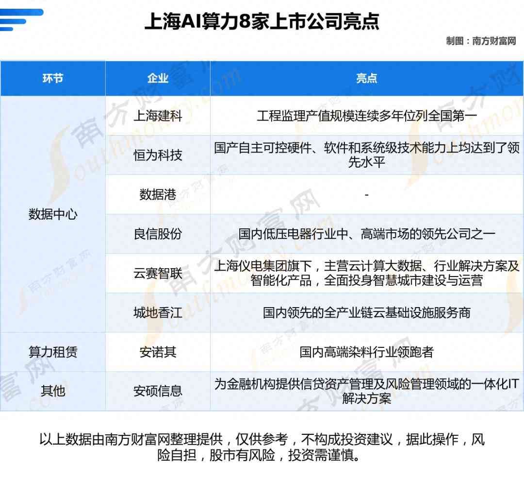 根据南方财富网产业链数据显示,云赛智联处于上海AI算力产业链中的数据中心环节;安诺其处于上海AI算力产业链中的算力租赁环节;良信股份处于上海AI算力产业链中的数据中心环节;城地香江处于上海AI算力产业链中的数据中心环节;数据港处于上海AI算力产业链中的数据中心环节;上海建科处于上海AI算力产业链中的数据中心环节。