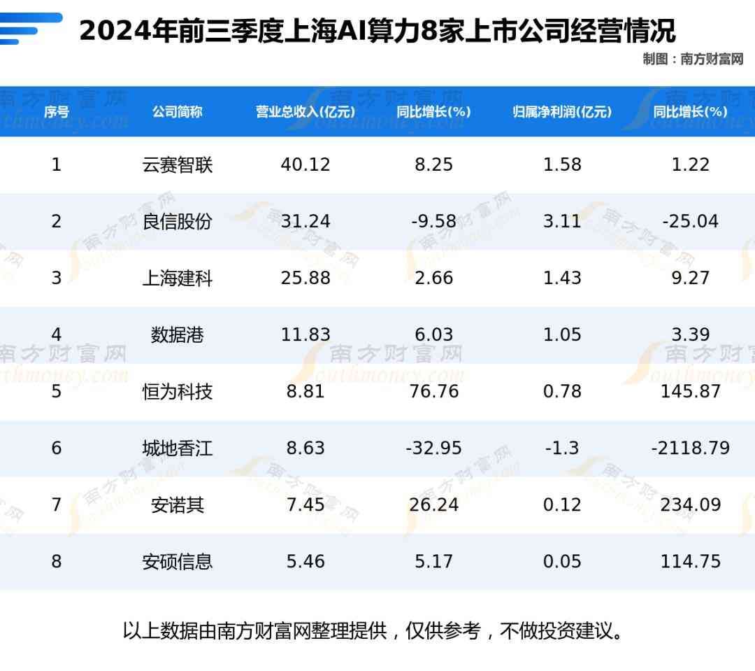 2024年前三季度,本文涉及的8家上海AI算力产业链相关上市公司营业收入合计139.41亿元,归母净利润共6.82亿元。其中,4家上市公司营业收入超十亿。营业收入排名依次为云赛智联、良信股份、上海建科、数据港、恒为科技、城地香江、安诺其、安硕信息。