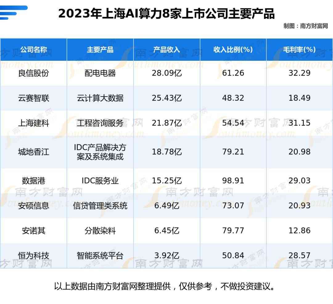 南方财富网产业链数据显示,主要产品来看,2023年良信股份主要收入来源产品为配电电器,收入占比61.26%,毛利率32.29%;云赛智联主要收入来源产品为云计算大数据,收入占比48.32%,毛利率18.49%;上海建科、城地香江、数据港、安硕信息、安诺其、恒为科技主要收入来源产品分别为工程咨询服务、IDC产品解决方案及系统集成、IDC服务业、信贷管理类系统、分散染料、智能系统平台,收入占比分别为54.54%、79.21%、98.91%、73.07%、79.77%、50.84%。