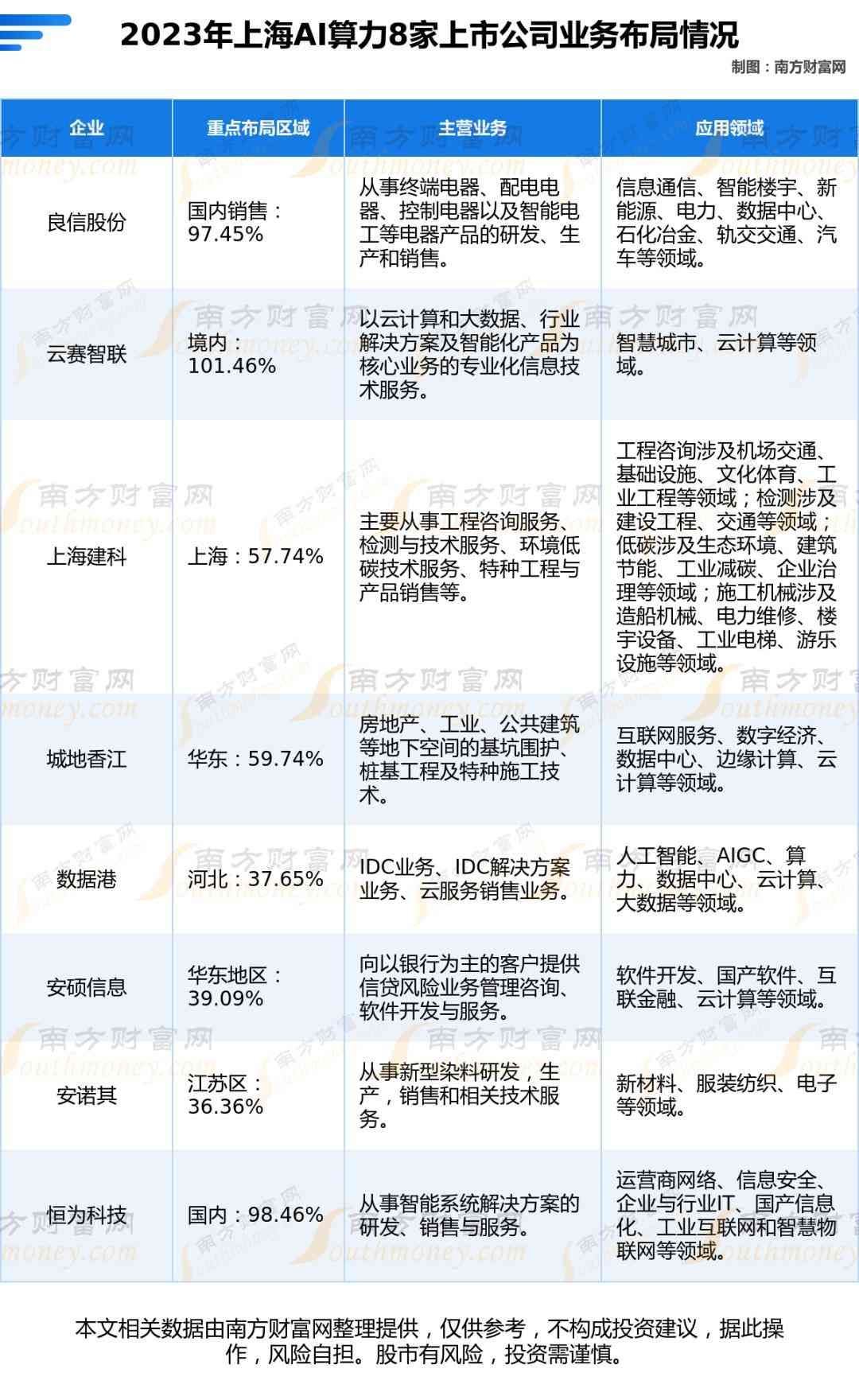 根据南方财富网产业链数据统计,业务布局上,2023年良信股份重点布局区域在国内销售,业务占比97.45%;云赛智联重点布局区域在境内,业务占比101.46%;上海建科、城地香江、数据港、安硕信息、安诺其、恒为科技重点布局区域分别在上海、华东、河北、华东地区、江苏区、国内,业务占比分别为57.74%、59.74%、37.65%、39.09%、36.36%、98.46%。