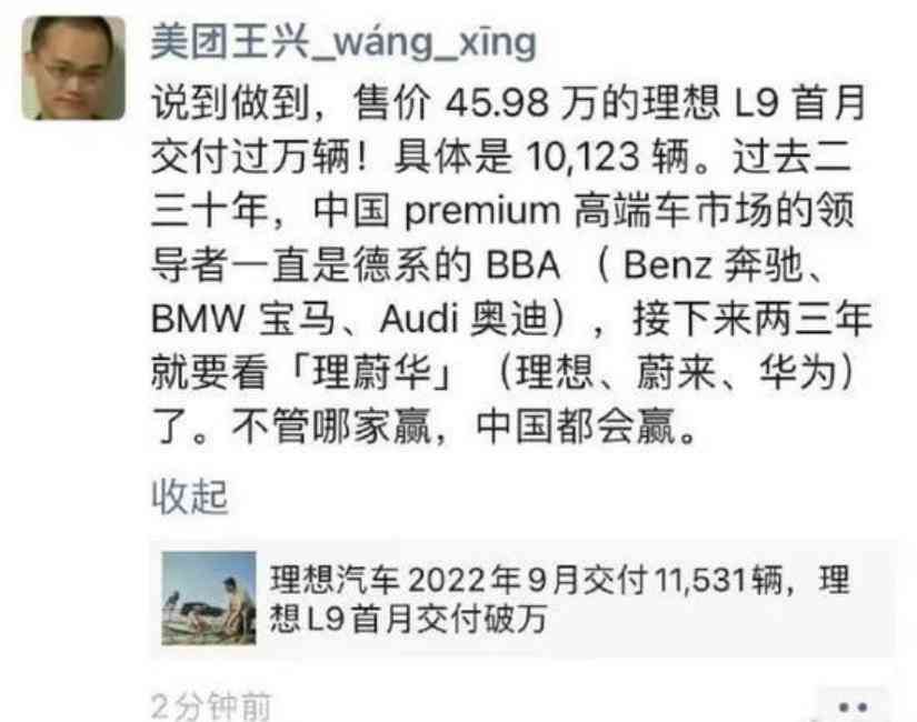 10月1日,在理想汽车公布销量数据时,美团创始人王兴发了一条消息: