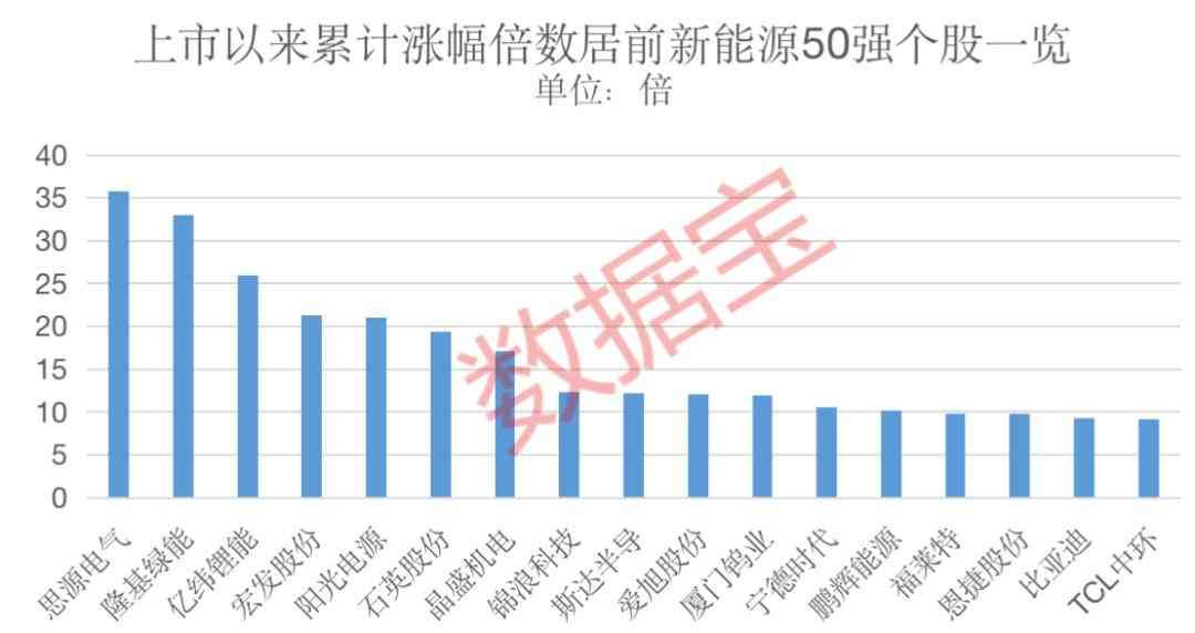 纵观榜单个股历史走势,13股上市以来股价涨超10倍,其中思源电气18年来累计涨35.73倍;隆基绿能10年累计涨32.95倍,亿纬锂能累计涨26倍,宏发股份累计涨21.32倍。