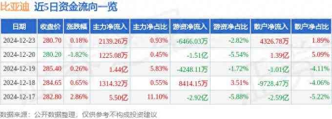 比亚迪(002594)12月23日主力资金净买入2139.26万元