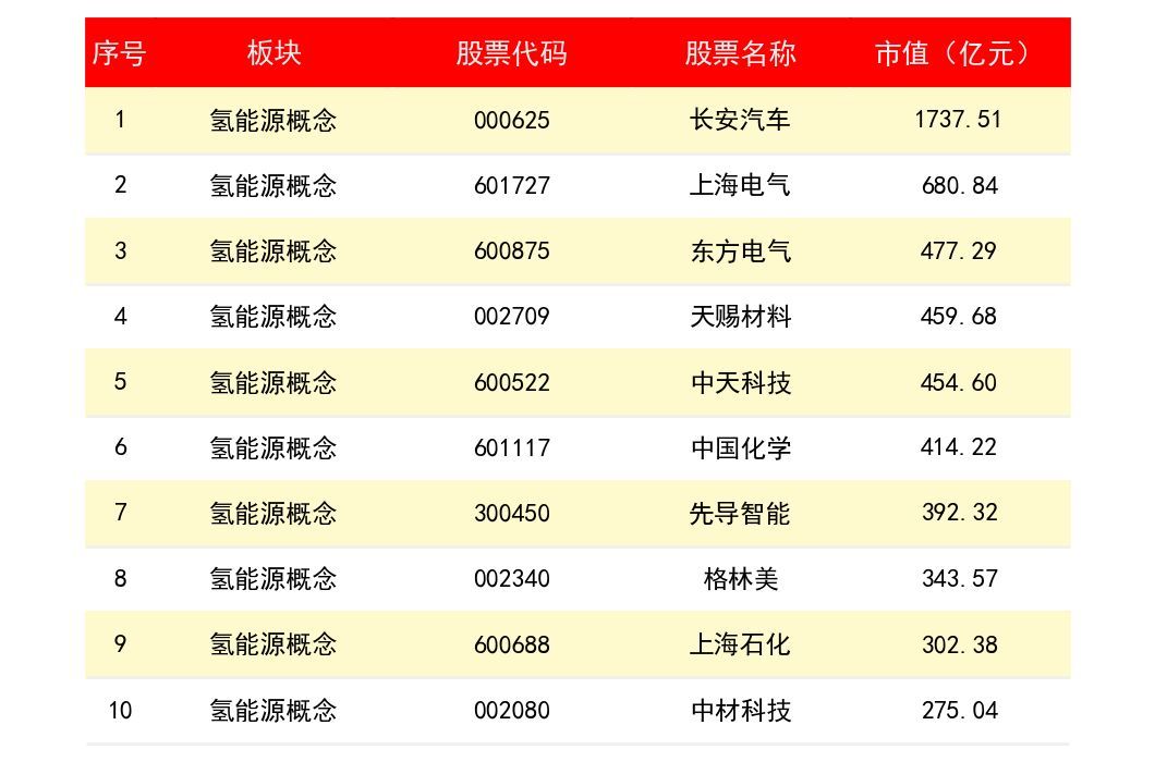 长安汽车(SZ625)总市值为 1737.51亿元;上海电气(SH601727)总市值为 680.84亿元;东方电气(SH6875)总市值为 477.29亿元。下表为所有氢能源概念上市公司龙头股市值排名一览表: