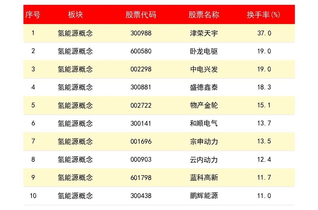 津荣天宇(3988)过去10日平均换手率为 37%;卧龙电驱(6580)过去10日平均换手率为 19%;中电兴发(2298)过去10日平均换手率为 19%。下表为所有氢能源概念上市公司龙头股最近10个交易日平均换手率排名一览表: