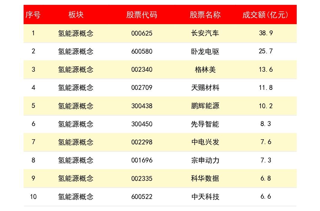 长安汽车(625)过去10日平均成交额为 38.9亿元;卧龙电驱(6580)过去10日平均成交额为 25.7亿元;格林美(2340)过去10日平均成交额为 13.6亿元。天赐材料(2709)过去10日平均成交额为 11.8亿元。。鹏辉能源(3438)过去10日平均成交额为 10.2亿元。。下表为所有氢能源概念上市公司龙头股最近10个交易日平均成交额排名一览表: