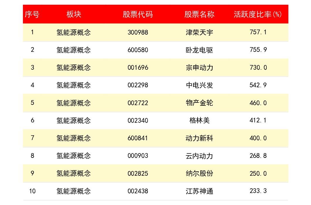 从成交活跃度排序来看,氢能源概念的公司龙头股有哪些?成交活跃度排名如何呢?