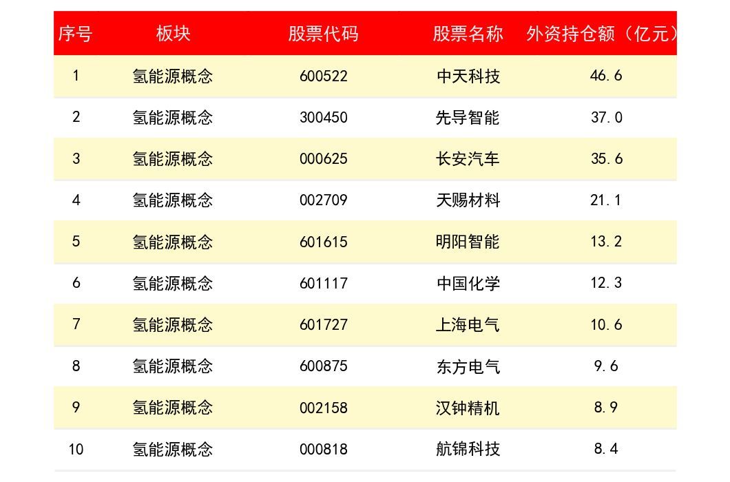 中天科技(6522)外资持仓额为 46.6亿元;先导智能(3450)外资持仓额为 37亿元;长安汽车(625)外资持仓额为 35.6亿元。天赐材料(2709)外资持仓额为 21.1亿元。明阳智能(601615)外资持仓额为 13.2亿元。下表为所有氢能源概念上市公司龙头股外资持仓金额排名一览表: