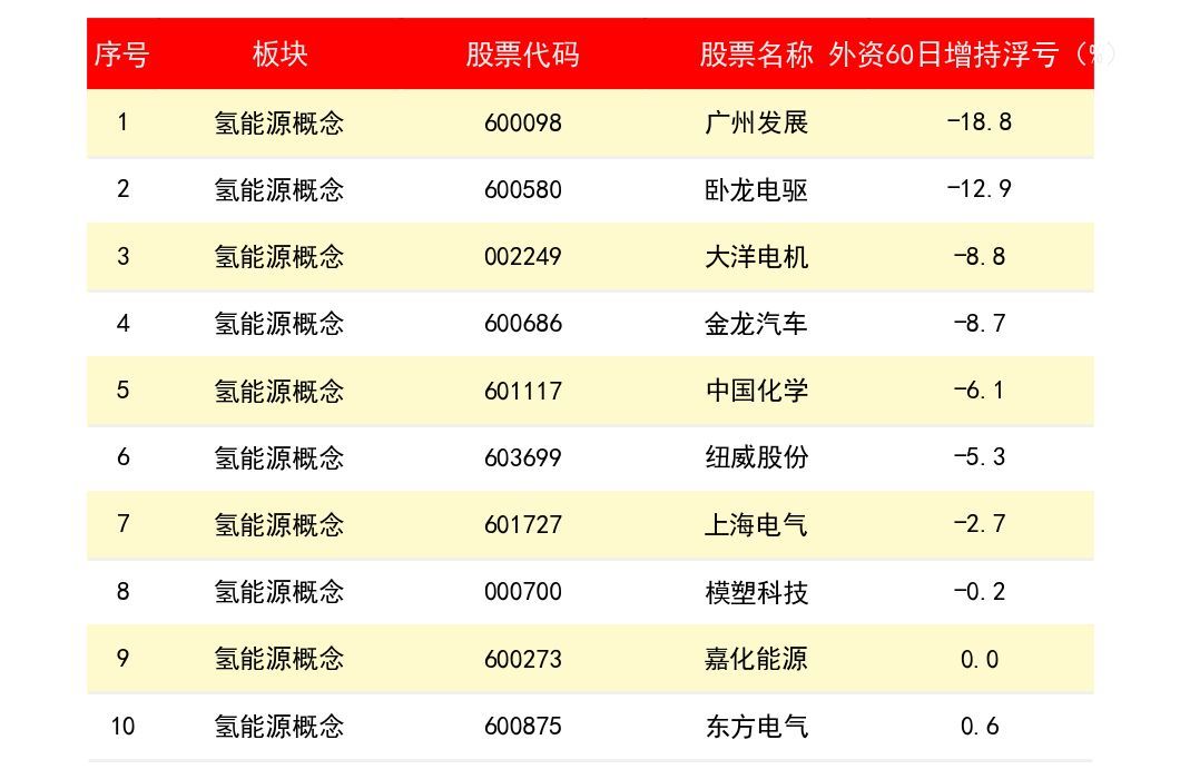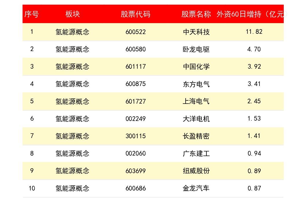 中天科技(6522)外资近60日增持金额为 11.82亿元;卧龙电驱(6580)外资近60日增持金额为 4.7亿元;中国化学(601117)外资近60日增持金额为 3.92亿元。下表为所有氢能源概念上市公司龙头股外资近60日增持金额排名一览表: