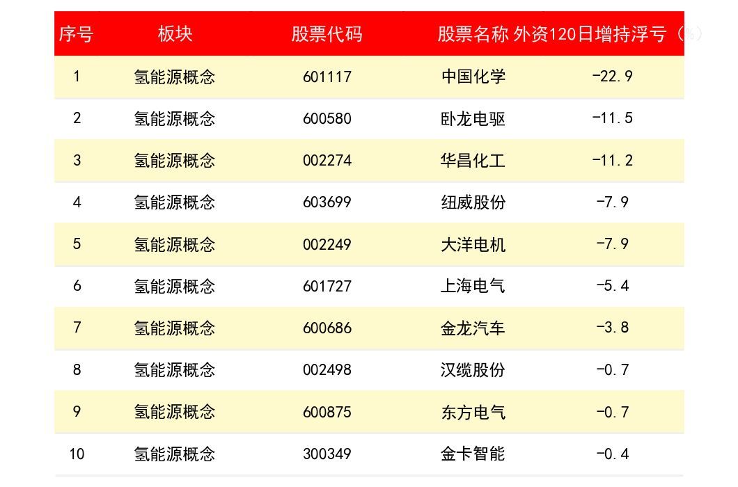 中国化学(601117)外资近120日增持浮亏水平为 -22.9%;卧龙电驱(6580)外资近120日增持浮亏水平为 -11.5%;华昌化工(2274)外资近120日增持浮亏水平为 -11.2%;纽威股份(603699)外资近120日增持浮亏水平为 -7.9%;下表为所有氢能源概念上市公司龙头股外资近120日增持浮盈浮亏水平排名一览表: