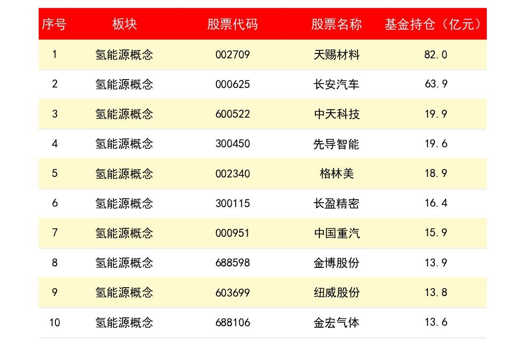 天赐材料(2709)公募基金持仓金额为 82亿元;长安汽车(625)公募基金持仓金额为 63.9亿元;中天科技(6522)公募基金持仓金额为 19.9亿元;下表为所有氢能源概念上市公司龙头股公募基金持仓金额排名一览表: