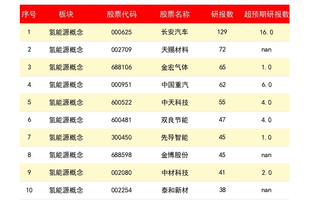 长安汽车(625)专业机构研报数为 129。天赐材料(2709)专业机构研报数为72。金宏气体(688106)专业机构研报数为 65。中国重汽(951)专业机构研报数为 62。中天科技(6522)专业机构研报数为 55。下表为所有氢能源概念上市公司龙头股专业机构研报数排名一览表: