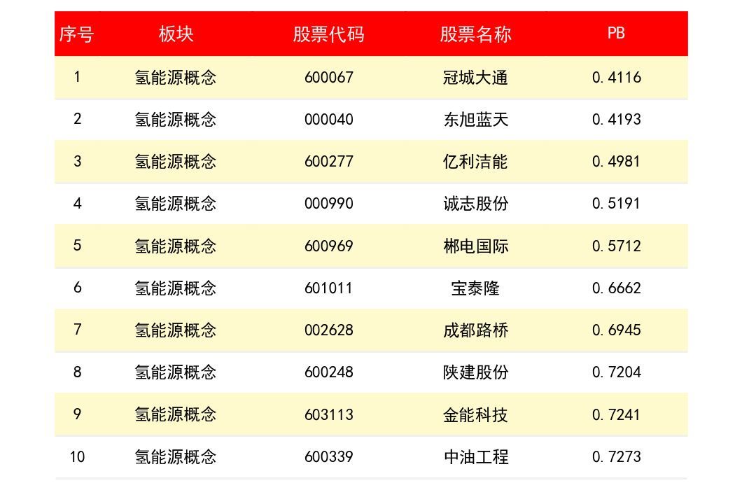冠城大通(667)PB为 0.4116;东旭蓝天(40)PB为0.4193;亿利洁能(6277)PB为 0.4981。诚志股份(990)PB为 0.5191。下表为所有氢能源概念上市公司龙头股PB排名一览表: