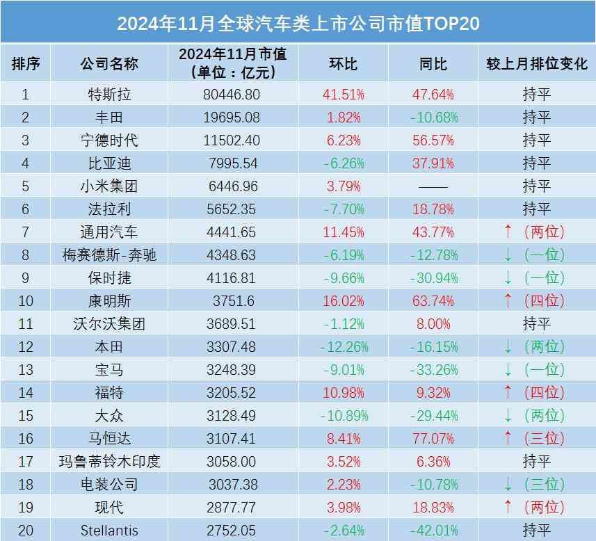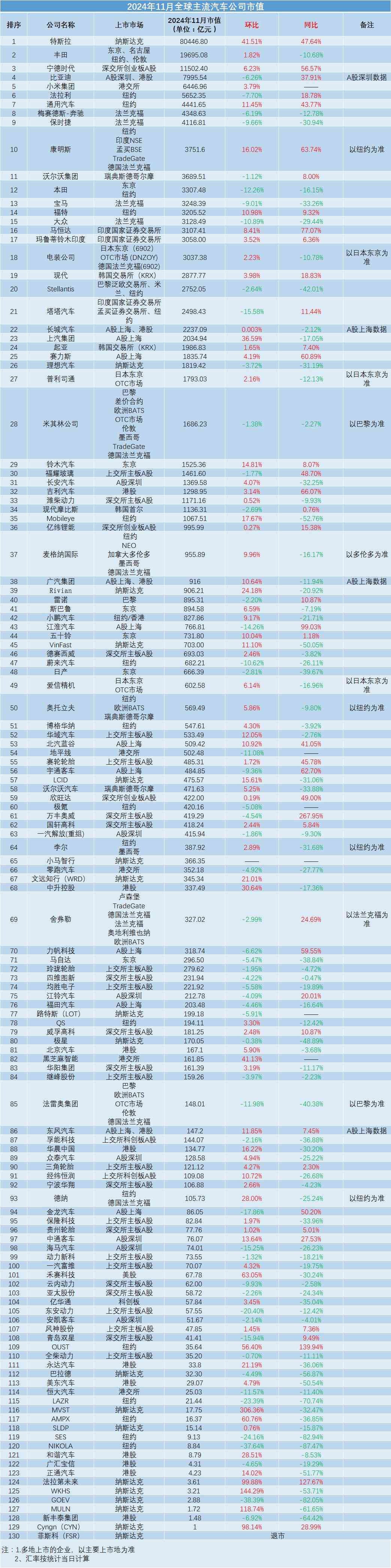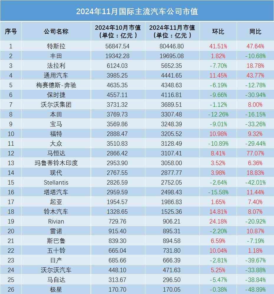 2024年11月《中国汽车报》汽车市值研究组继续对全球汽车类上市公司月度市值变化进行全面跟踪、梳理和比较分析。并基于2023年全年的数据积累基础上,对全球汽车类上市公司的年度市值表现进行总结,并对2024年市值变化趋势进行预判。为读者提供更丰富、更详实、更客观、更多元、多维度的市值变化数据分析。