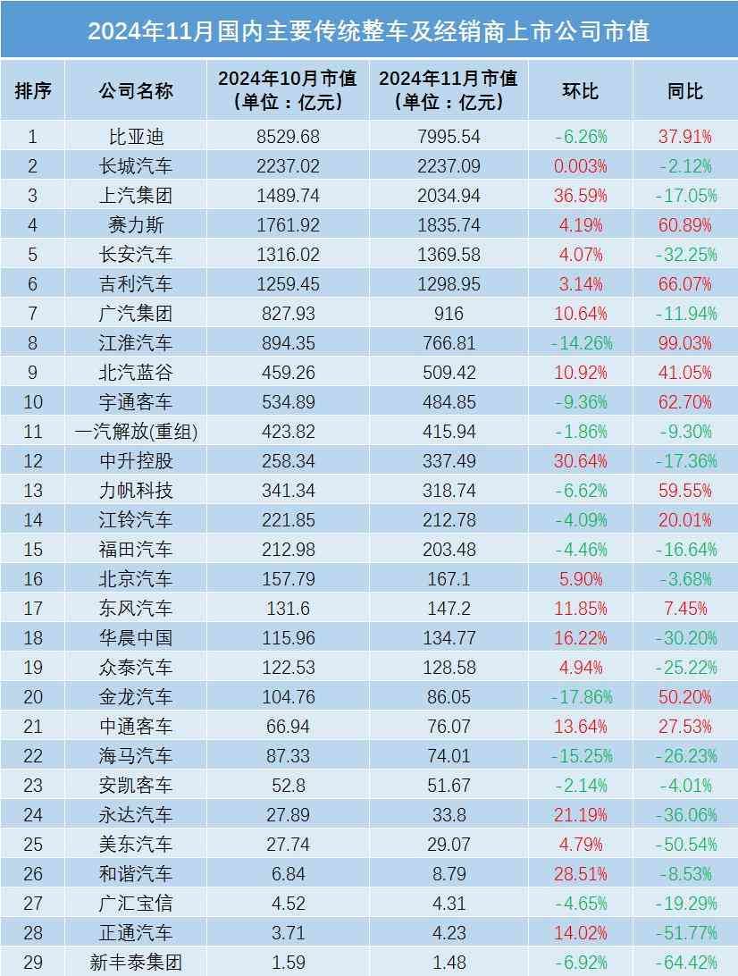 2024年11月,沪深两市成交额合计达41.32万亿元,创A股历史单月成交额新纪录,日均成交额约1.97万亿元。当月,在国内主要传统整车及经销商上市公司市值中,有近6成环比上涨,与上月的情况形成反转。从个股市值环比看,没有了以往的大起大落,即使是市值环比下降者,幅度也已显著收窄。