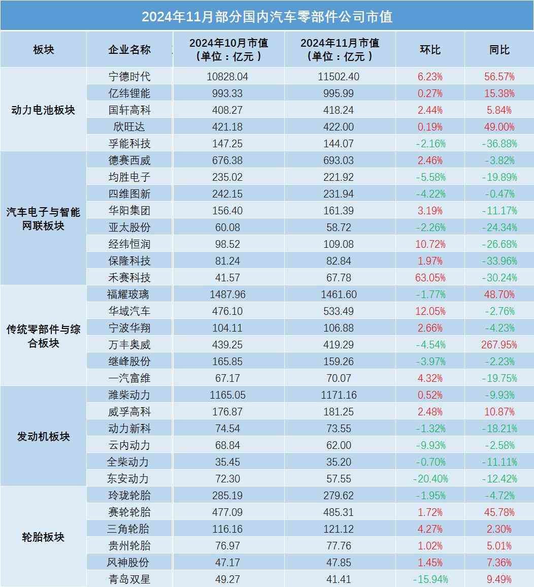 展望12月,在汽车以旧换新等诸多政策加持、车市冲刺全年销量目标,以及A股市场持续推进提质增效的背景下,国内主要传统整车及经销商上市公司有望迎来新的利好,实现年终圆满收官。国内部分汽车零部件公司市值