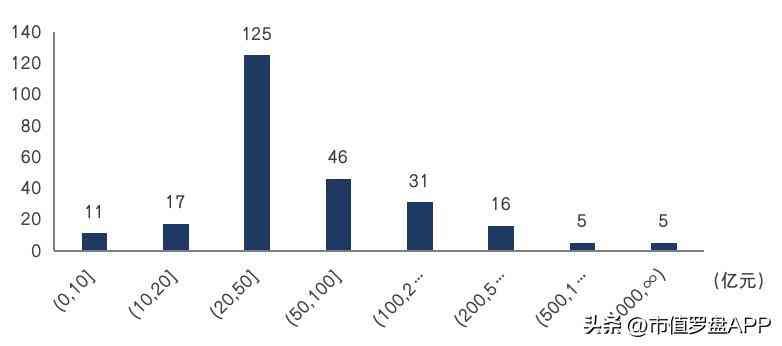 2022年10月31日,汽车行业A股上市公司共计256家,总市值33837亿元。20~50亿区间的上市公司125家,占比(49%)最多;50~1亿区间的上市公司46家,占比(18%)次之;超过1亿的上市公司5家。
